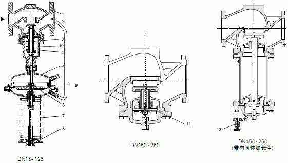 7 | 弹簧 | 8 | 调节螺母 | 9 | 导压管 | 10 | 波纹管 | 11 | 平衡膜片 | 12 | 充注阀 |